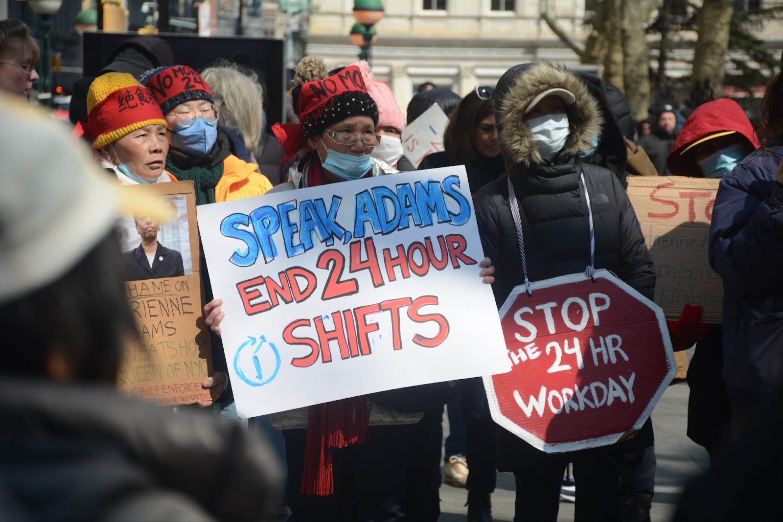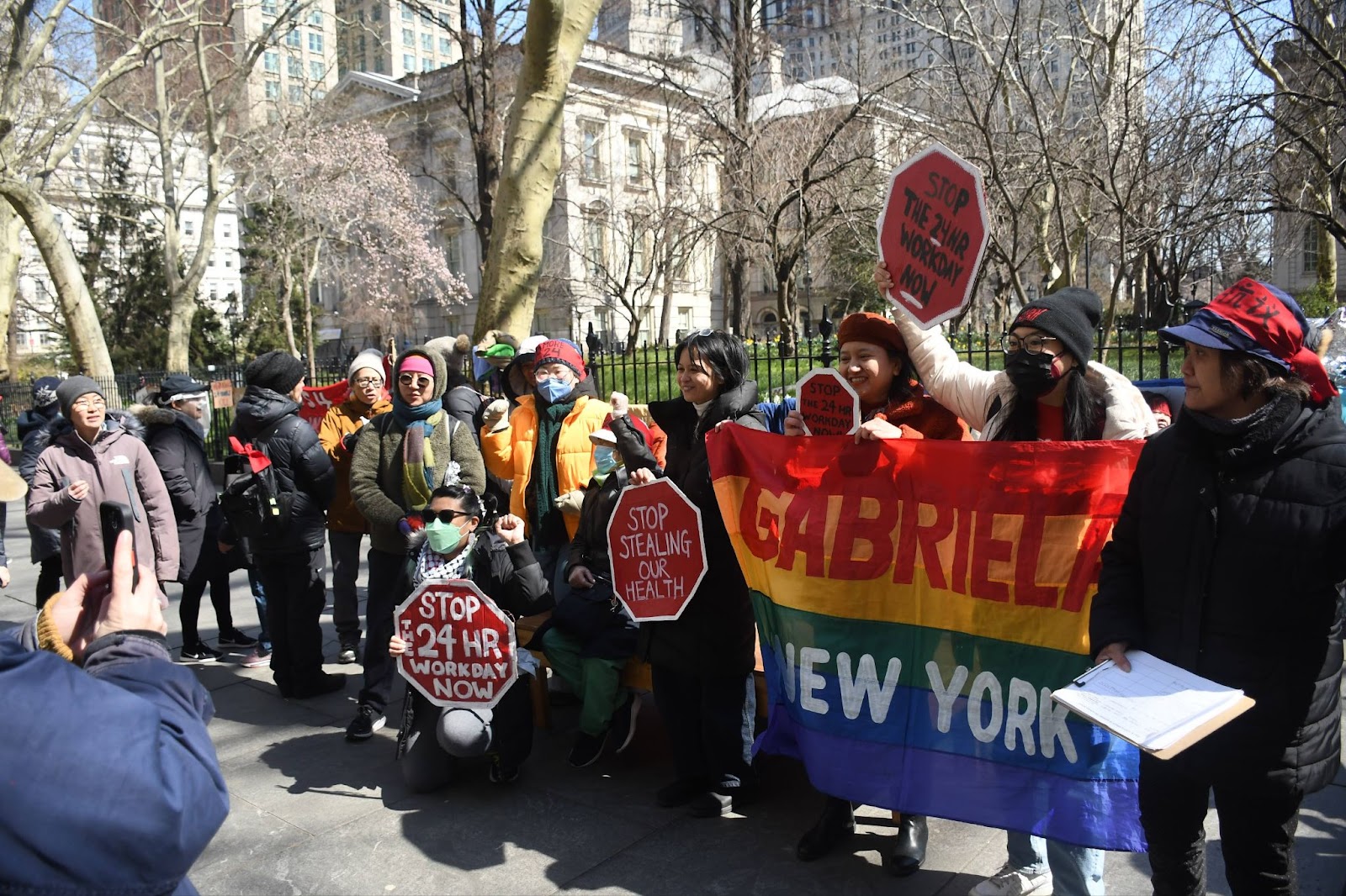 Tragically, we were told the experiences observed on day three of this week-long Hunger Strike in front of City Hall are far less detrimental to these women’s health than years spent working as Home Health Aides. Many retirees lined the streets, pleading for Speaker Adrienne Adams to progress NYC Council Resolution 615-2024, or the “No More 24 Act,” to the floor for consideration. Guihua Song, from the Chinese Staff and Workers’ Association, vocalizes through a translator, said that the fight is personal; as retirees, “[…] we have been through this […] we know the damage that 24-hour work days have brought to our health and our families.”